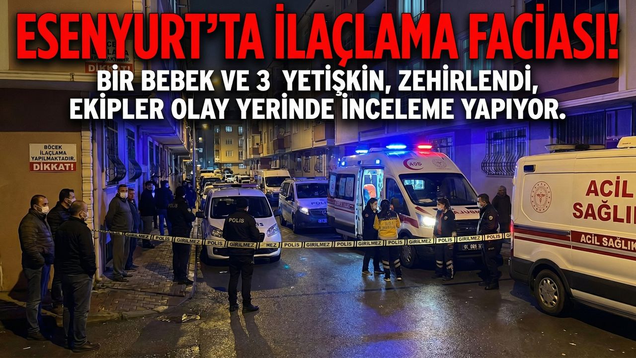 Olay, saat 18.30 sıralarında Esenyurt Çınar Mahallesi'ndeki 5 katlı bir binada gerçekleşti. Edinilen bilgiye göre, binanın bodrum katına böcek ilacı atıldı. Yüksek dozda yapılan ilaçlama nedeniyle bina sakinlerinden biri bebek 4 kişi zehirlendi. İhbar üzerine olay yerine sağlık ve polis ekipleri sevk edildi. Olay yerine gelen sağlık ekipleri ilk müdahalenin ardından aileden 4 kişiyi tedbir amaçlı hastaneye kaldırdı. Ekiplerin olay yerindeki çalışması sürüyor.