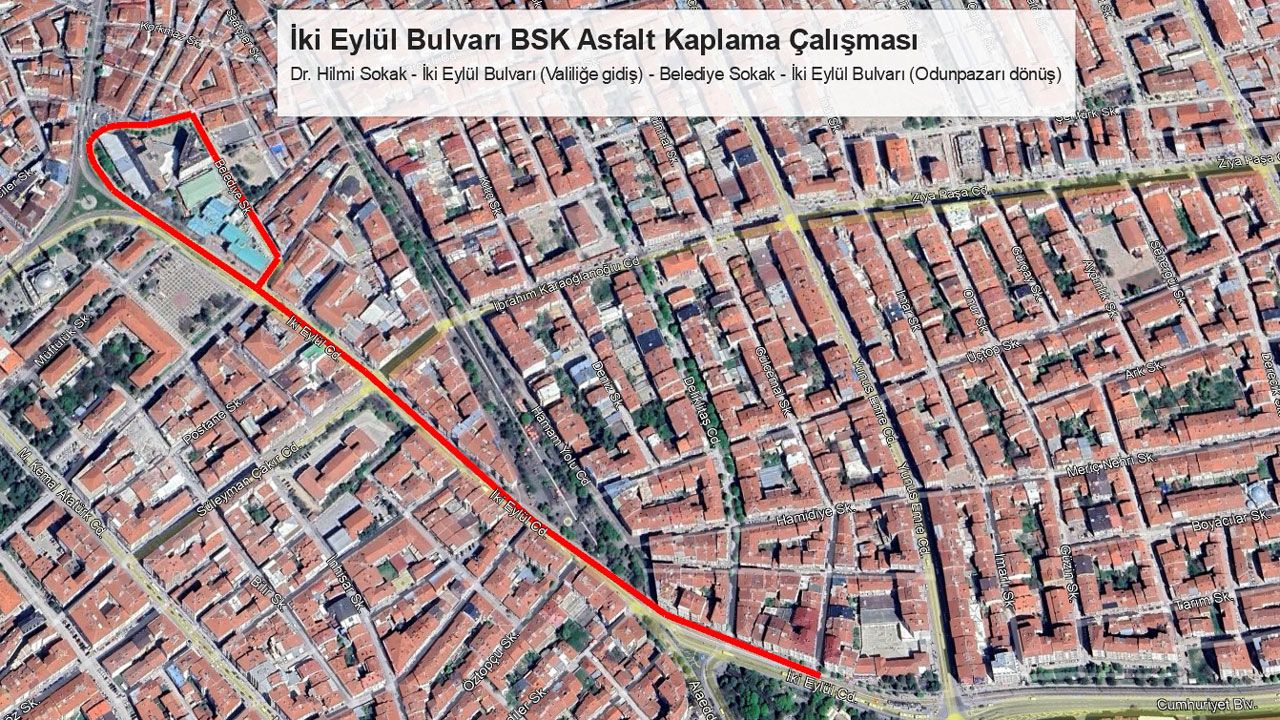 Büyükşehir Belediyesi’nden yapılan açıklamada şu ifadelere yer verildi: “Yol Yapım Bakım Onarım Dairesi Başkanlığımızca İki Eylül Bulvarı ve Belediye Sokakta BSK (Bitümlü Sıcak Karışım) Asfalt kaplama çalışması yapılacaktır.
