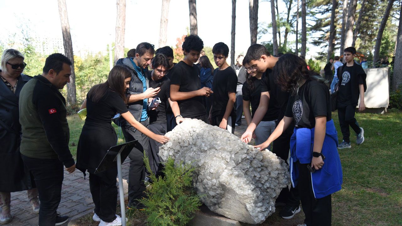 Daha sonra Kayaç parkı gezen Atayurtlu öğrenciler, burada Türkiye’nin çeşitli illerinden getirilen 70 kadar kaya ve maden örneklerini inceleme ve dokunma fırsatı buldu. Objeler hakkında bilgiler veren Orman Mühendisi Dr. Hakan Demirbağ, öğrencilere toprak oluşumunu ve kayaçların doğadaki önemini anlattı.