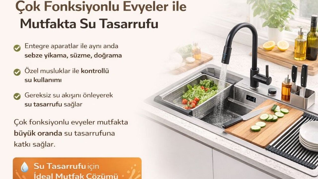 Çok fonksiyonlu evyeler, entegre aparatlar ve akıllı tasarımları sayesinde su kullanımını optimize eder. Sebze yıkama, süzme, doğrama ve durulama gibi işlemler tek bir alanda yapılabildiği için gereksiz su akışı azaltılır. Böylece hem zamandan tasarruf edilir hem de su tüketimi minimum seviyeye indirilir.