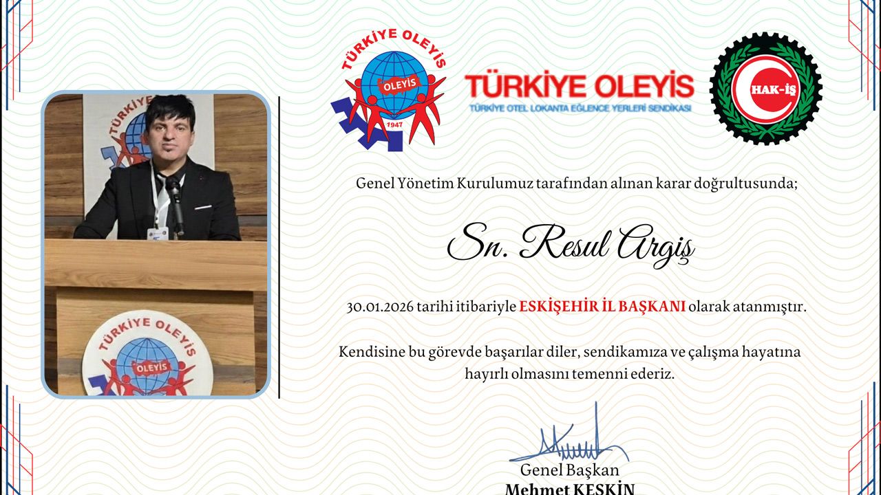 Hak-İş Konfederasyonu’na bağlı Türkiye Otel Lokanta Eğlence Yerleri Sendikası (OLEYİS), Resul Argiş’in Eskişehir İl Başkanlığı görevine atandığını resmi olarak duyurdu.