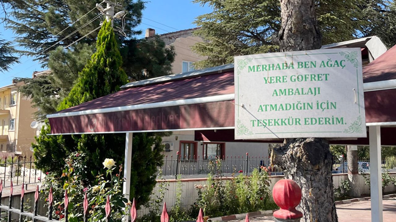 Eskişehir'deki bir cami bahçesindeki ağaçlara asılan yazılı tabelalar, çevre temizliği konusunda farkındalık oluşturuyor.