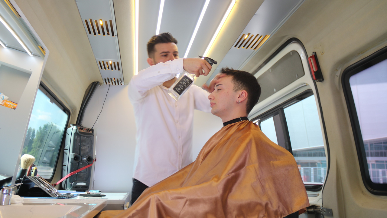 Eskişehir'de yaşayan erkek kuaförü Caner Yıldırım, 1 milyon 250 bin TL harcayarak içini berber dükkânı şeklinde dizayn ettiği minibüs ile müşterisinin ayağına giderek hizmet veriyor. Ağdadan, yüz maskesine kadar birçok hizmetin verildiği araç, elektriğini ise güneşten sağlıyor.