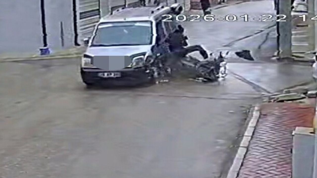 Eskişehir'de iki sokak kesişimde motosikletin panelvan araca yandan çarpma anı anbean güvenlik kamerasına yansırken kurye ağır yaralandı.