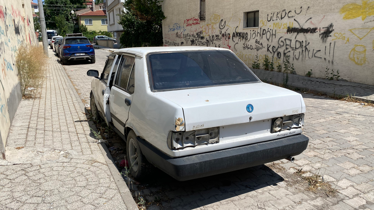 Eskişehir'de bir ara sokak üzerinde kapısı açık ve plakasız vaziyette duran hurda otomobil merak konusu oldu.