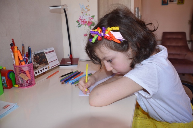 Eda aslında aynı zamanda bir seramik sanatçısı. Güzel Sanatlar Fakültesi Dekanı olan ve emekli olan Zehra Çobanlı hocam ile tanıştık. Eda da onunla seramik çalışmaları yapmaya başladı. Eda orada birçok seramik eser çıkardı. Açılan karma sergide Eda’nın da bir eseri yer aldı. Bunun dışında hem Eda’nın hem de Ela’nın müziğe de ilgisi var. Eda seçmeli ders olarak müziği seçti. Bir dönem gitar çalmayı denedi. Arkadaşlarından görüp piyano çalmak istedi ama piyanoda el kol koordinasyonu nedeniyle zorlandı. Şimdi Eda org çalıyor, Ela da flüt çalıyor. Ela ayrıca dans etmeyi çok seviyor. Bir dönem her iki kızım da bale yaptı. Haftada bir gün müzik öğretmeni geliyor ve her iki kızımız da müzik eğitimi alıyor.