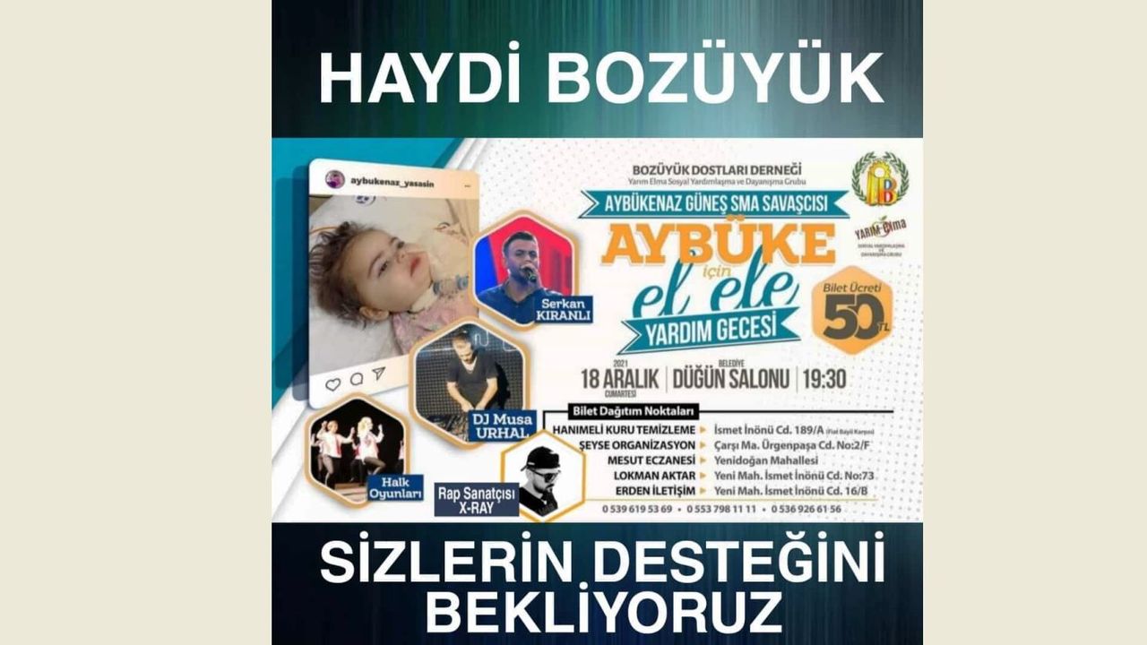 Biz de Bozüyük Dostları Derneği olarak insanlık görevimizi yerine getirme adına Yarım Elma Sosyal Yardımlaşma ve Dayanışma Kolumuzun organize etmesiyle 18 Aralık Cumartesi günü saat: 19.30'da Bozüyük Belediye Düğün Salonunda Aybükenaz ile dayanışma gecesi yapacağız. Yardım ve dayanışma gecesi için satılan biletlerin tüm geliri Aybükenaz bebeğin banka hesabına yatırılacaktır."