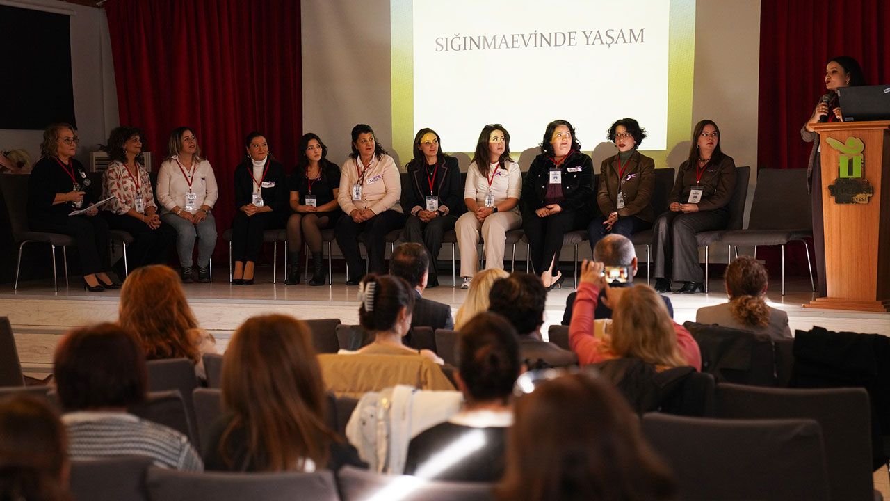 EMO Kadın Komisyonu Başkanı Nazan Erşahin’in moderatörlüğünü gerçekleştirdiği söyleşide Tepebaşı Belediyesi Kadın Sığınmaevi personelleri de konuşmacı olarak yer aldı. Söyleşide kadınlar şiddetsiz bir dünya mesajı verdi.