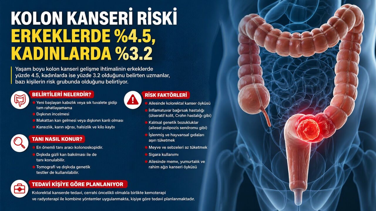 Yaşam boyu kolon kanseri gelişme ihtimalinin erkeklerde yüzde 4.5, kadınlarda ise yüzde 3.2 olduğunu belirten Genel Cerrahi ve Cerrahi Onkoloji Uzmanı Prof. Dr. Serdar Yol, 'Ailesinde kolorektal (kolon) kanser öyküsü, inflamatuvar bağırsak hastalığı (ülseratif kolit, crolin hastalığı gibi), kalıtsal genetik bozukluğu olanlar (ailesel polipozis sendromu varlığı gibi), işlenmiş ve hayvansal gıdaları aşırı tüketenler, meyve ve sebzeleri az tüketenler, sigara kullananlar, ailesinde meme yumurtalık ve rahim ağzı kanseri olan kişiler kolon kanseri açısından risk grubundadır' dedi.