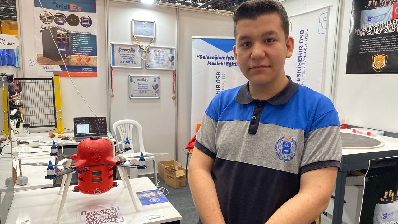 Özel Eskişehir OSB Teknik Koleji 10. sınıf Plastik Bölümü öğrencisi Yiğit İşbilirler, elektronik aksamı hariç gövdesini tamamen kendi 3D baskı makinesiyle yangın söndürme dronu üretti. Elektronik aksamı haricinde gövdesini ve her şeyini kendi ürettikleri yazıcıda yaptıklarını anlatan İşbilirler, "Böylelikle Türkiye'de olan dronların üstüne bir şeyler katarak kendi yangın söndürme dronumuzu ürettik. İçindeki söndürme topu sayesinde 5 kilometrelik bir alanı yangın yayılmadan ateşin olduğu yere gidip söndürüyor. Aslında amacımız yayılmadan yangını söndürmek. Fuarda çok ilgi gören dronlar arasından birisi. Önümüzdeki günlerde MEB Robot Yarışması'na gideceğiz" dedi.