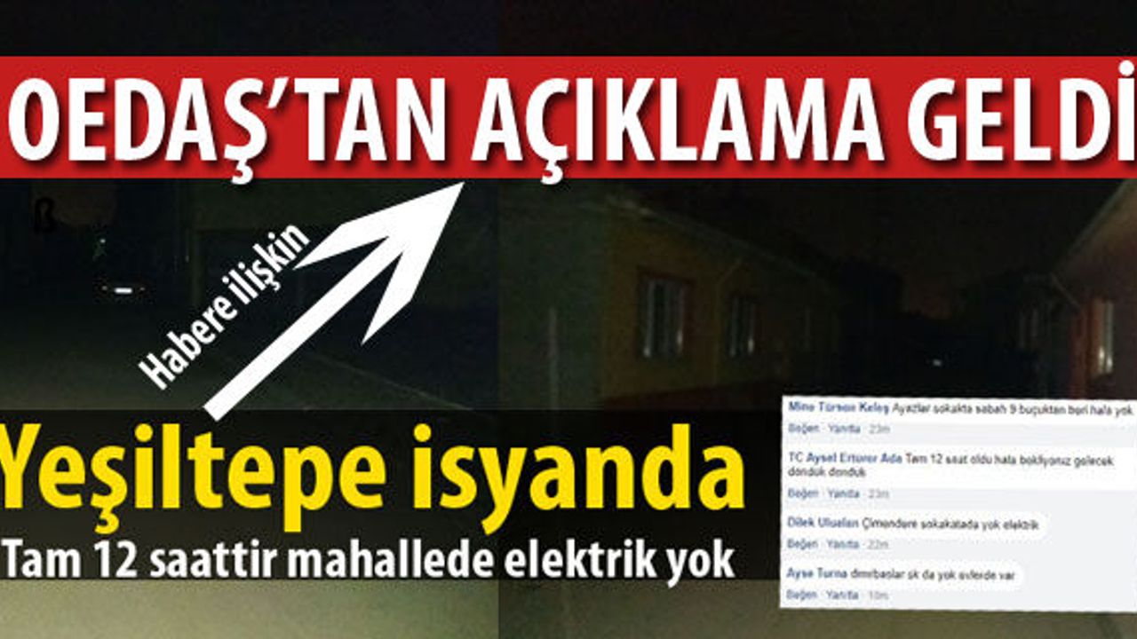 19 Şubat tarihinde yayınlanan ‘Yeşiltepe isyanda’ başlıklı habere ilişkin Osmangazi Elektrik Dağıtım Anonim Şirketi’nden (OEDAŞ) açıklama geldi. Yapılan açıklamada Yeşiltepe Mahallesindeki söz konusu enerji kesintisi, yatırımlar nedeniyle yapıldığı aktarılarak, Yeşiltepe Mahallesindeki söz konusu enerji kesintisi, yatırımlarımız nedeniyle yapılmış olan ilanlı kesintidir. Fakat yaşanılan arızalar nedeniyle uzamış ve bölgeye kısmi enerji verilerek saat 22.00’de bölgenin tamamına enerji verilebilmiştir” denildi.