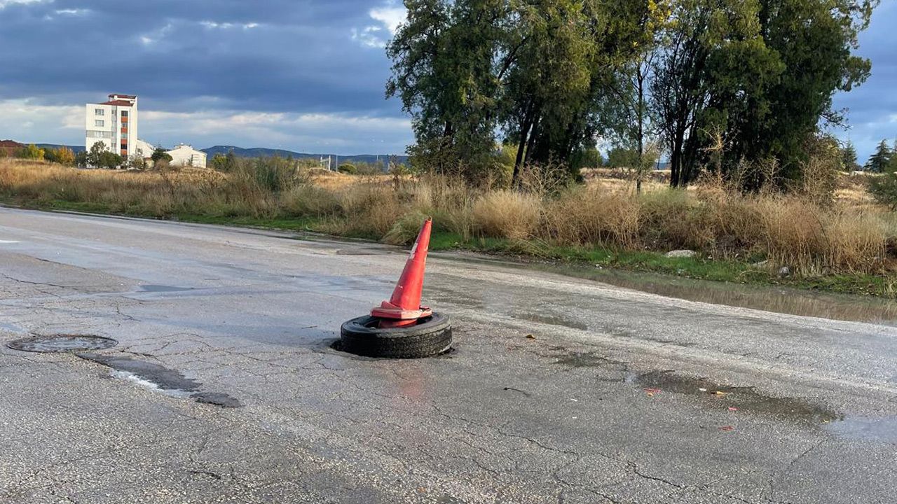 Eskişehir’de Soner Özübek Okulu önünde bulunan yolda, uzun süredir onarılmayan bozuk logar kapağı tehlike saçıyor. Çevre sakinleri ve sürücüler, kapağın oluşturduğu çukura dikkat çekmek amacıyla üzerine trafik konisi ve eski bir lastik yerleştirdi.