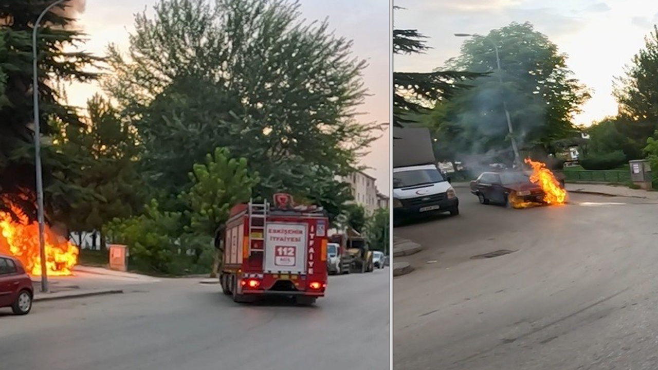 Eskişehir’de Tofaş marka aracın alev alev yanma anı, oradan geçen bir motosiklet kullanıcısının kask kamerasına yansıdı.