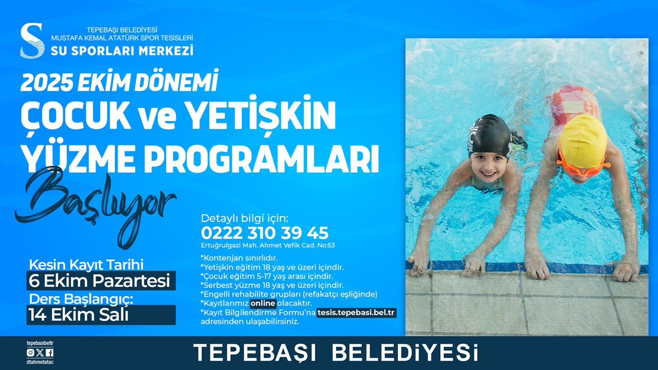 Tepebaşı Belediyesi Mustafa Kemal Atatürk Spor Tesisleri Su Sporları Merkezi’nde düzenlenecek olan 2025 Ekim dönemi çocuk ve yetişkin yüzme kursları için başvurular başlıyor.