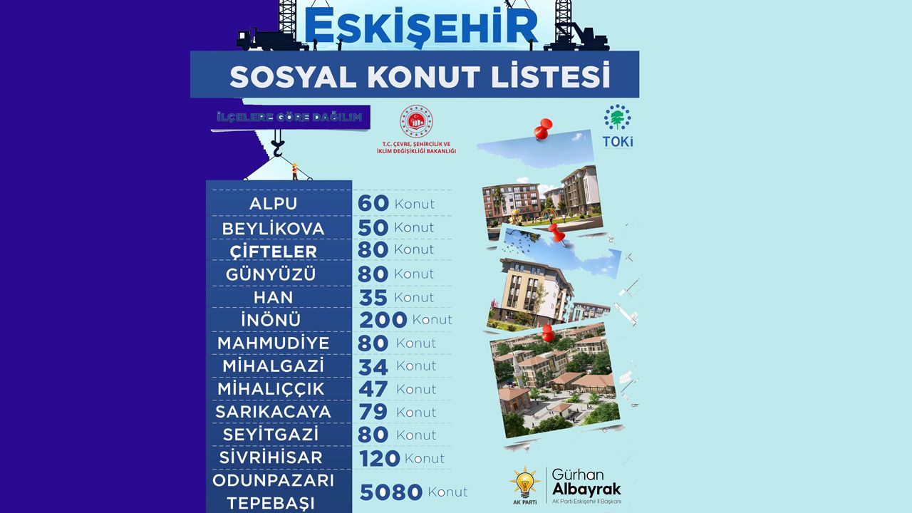 Başkan Albayrak'ın konuyla ilgili açıklamasında, "Ev sahibi Türkiye, ev sahibi Eskişehir! Yüzyılın Konut Projesi kapsamında, Cumhurbaşkanımız Recep Tayyip Erdoğan'ın liderliğinde ve Çevre, Şehircilik ve İklim Değişikliği Bakanımız Sayın Murat Kurum'un öncülüğünde, Eskişehir'de 14 ilçemizin tamamına kazandıracağımız sosyal konut sayıları; Alpu 60, Beylikova 50, Çifteler 80, Günyüzü 80, Han 35, İnönü 200, Mahmudiye 80, Mihalgazi 34, Mihalıççık 47, Sarıcakaya 79, Seyitgazi 80, Sivrihisar 120, Odunpazarı ve Tepebaşı 5 bin 80. '500 Bin Sosyal Konut Projesi' başvuruları 10 Kasım 2025 tarihinde başlayacaktır ve hemşehrilerimiz başvurularını yalnızca resmî kanallar üzerinden yapabilecektir" ifadeleri yer aldı.