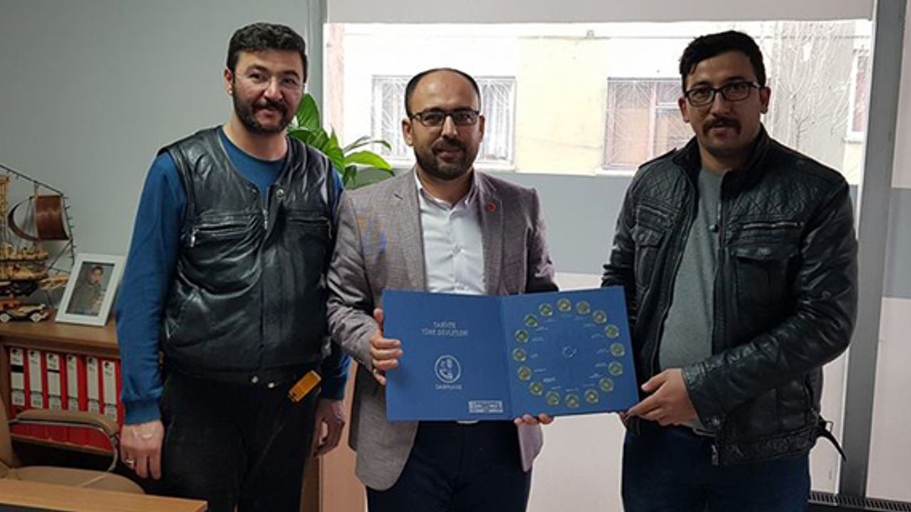 Başkan Engiz, Murat Ovalıya ziyaret anısına 16 Büyük Türk Devletinin Para Üzerine Basılı Sembolik Bayraklarını Hediye Etti...