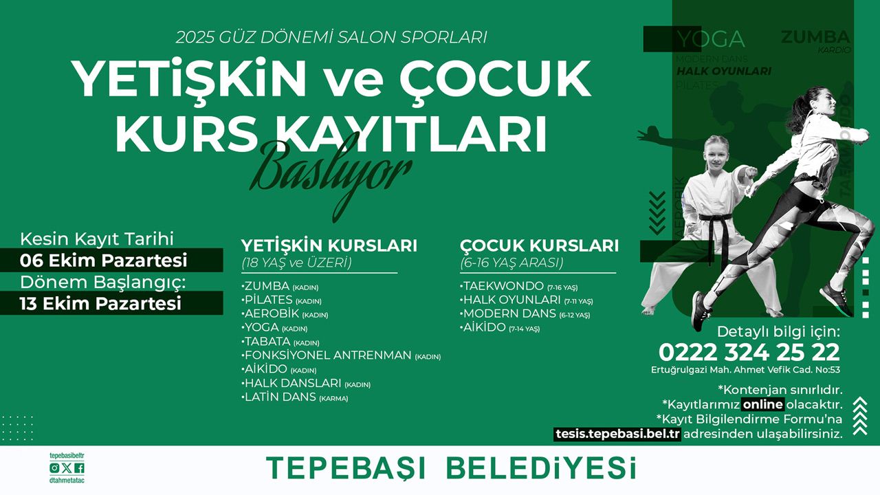 Tepebaşı Belediyesi Mustafa Kemal Atatürk Spor Tesisleri Su Sporları Merkezi’nde yetişkinlere yönelik düzenlenecek 2025 güz dönemi salon sporları kursları için kayıtlar başlıyor.